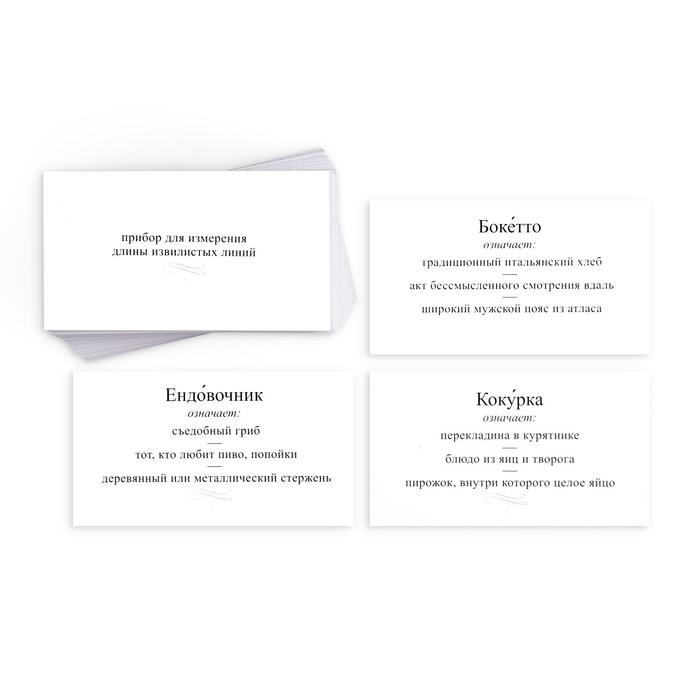 На лицевой стороне карточки написано слово, которое нечасто встретишь в современной русской речи, и три варианта его толкования. Правильный вариант только один. Задача игрока – определить его. Чтобы проверить себя или другого участника, просто переверните карту. Там находится ответ.