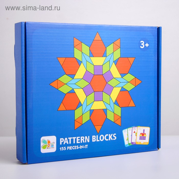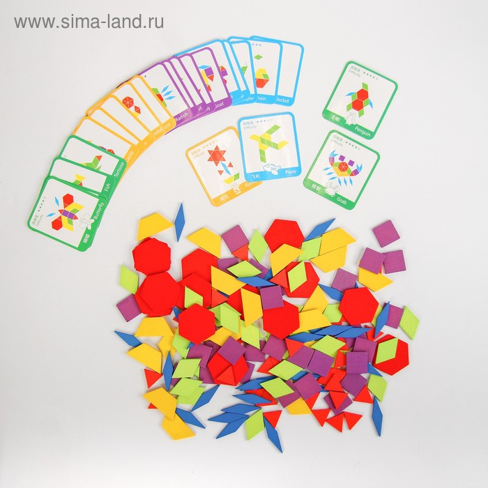 В наборе есть 24 карточки с примерами изображений, которые ребёнку предстоит составить из цветных деталей.
