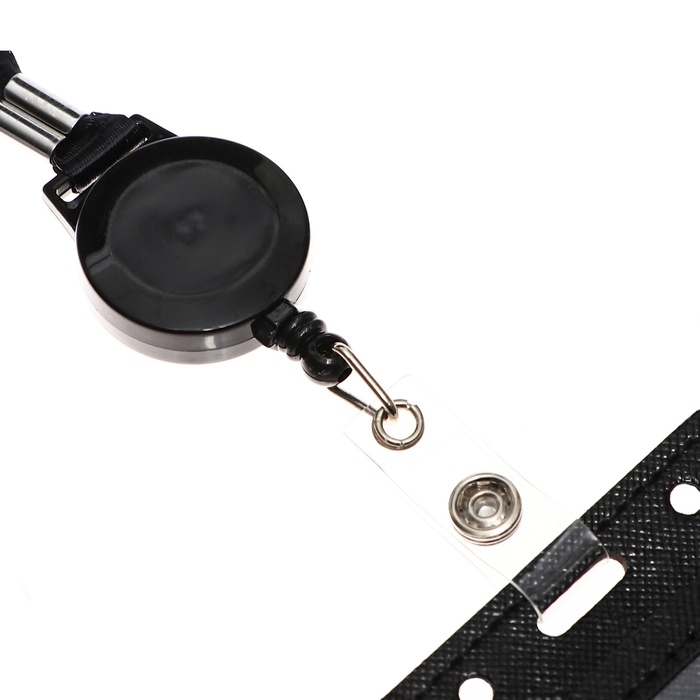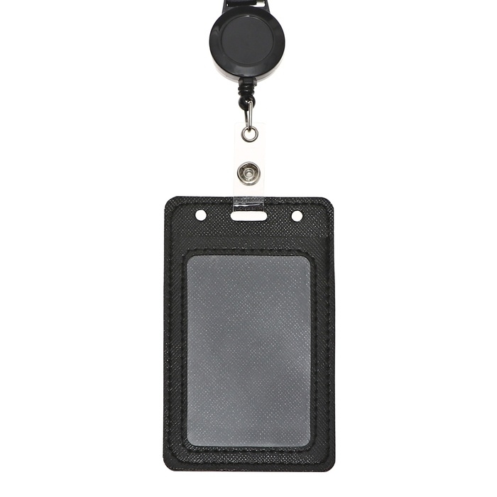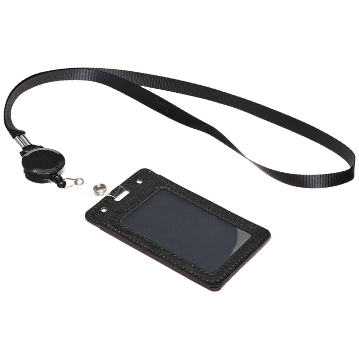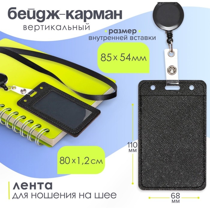 Бейдж-карман вертикальный кожзам, внешний 110x68мм, внутренний 85x54мм, лента 80x1,2см, чёрный.