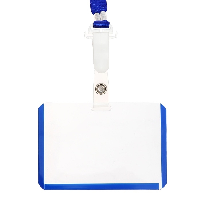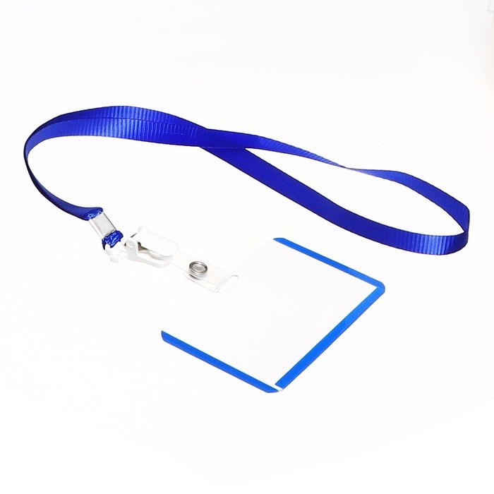 Бейдж-карман горизонтальный пластиковый, внешний 100x68мм, внутренний 85x54мм, лента 80x1,2см, синий.