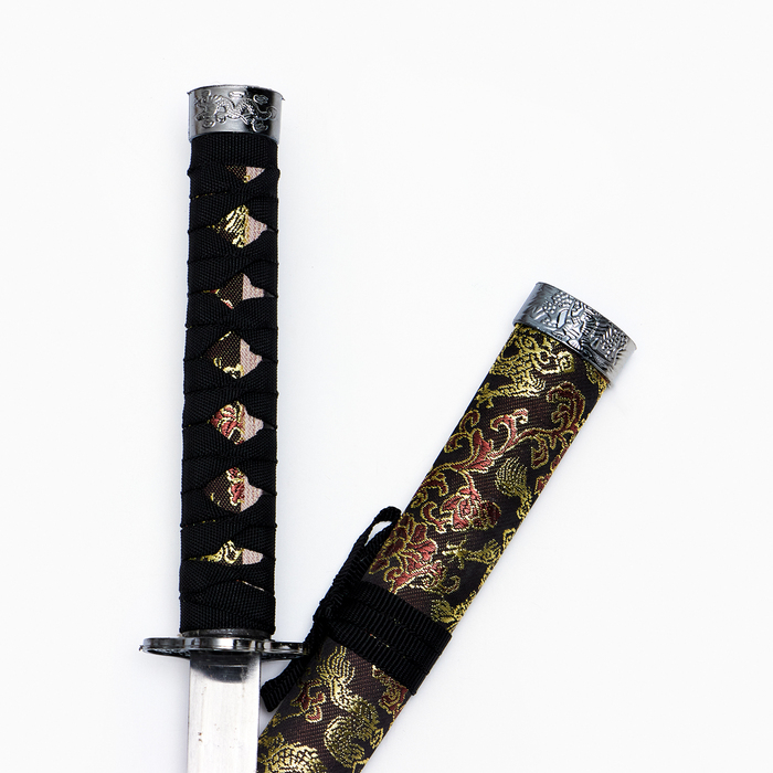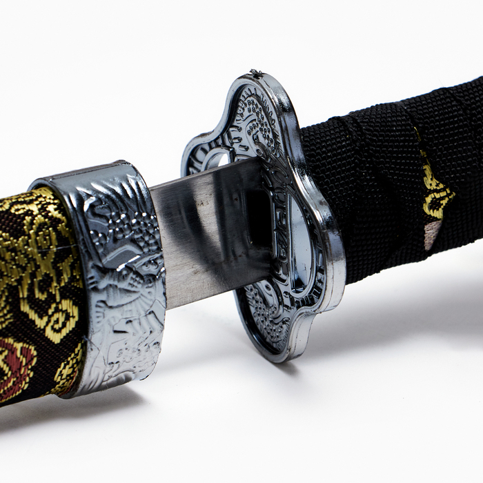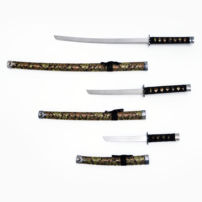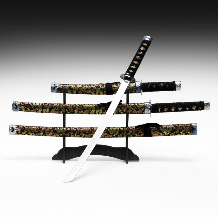 Сув. изделие катаны 3в1 на подставке, ножны ткань, драконы золото на черном 47/70/89см