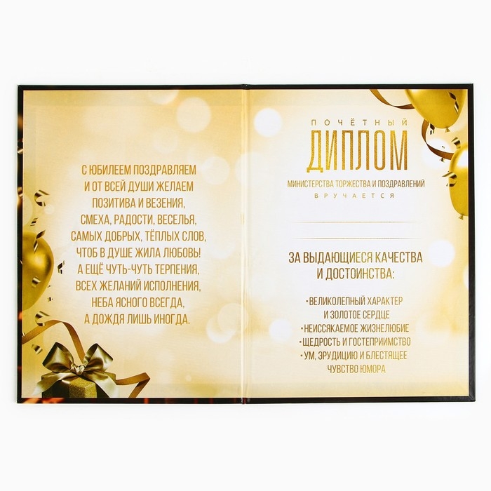 Праздничный диплом — прекрасный вариант оригинального поздравления. Изящные изображения, тёплые искренние слова, поле для имени получателя и список достижений — вот яркие черты этого аксессуара. На любом празднике приветствуются как официальные поздравления, так и шуточные. Креативное дизайнерское решение и невероятно позитивное содержание диплома удивят виновника торжества и зарядят присутствующих положительными эмоциями. Изделие выполнено из качественного ламинированного картона и бумаги.