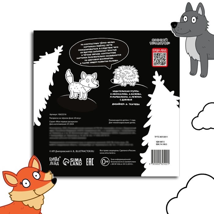 Раскраска на чёрном фоне «В лесу», 19 × 19 см, 16 стр., Синий трактор