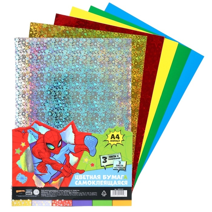 Бумага цветная самоклеящаяся А4, 6 листов, 6 цветов, 80 г/м2, Человек-паук