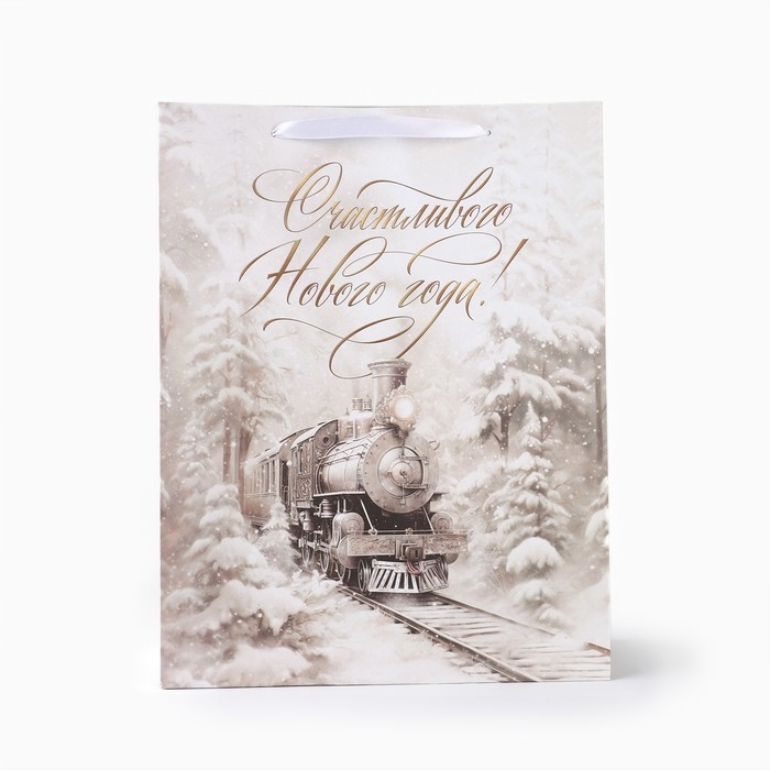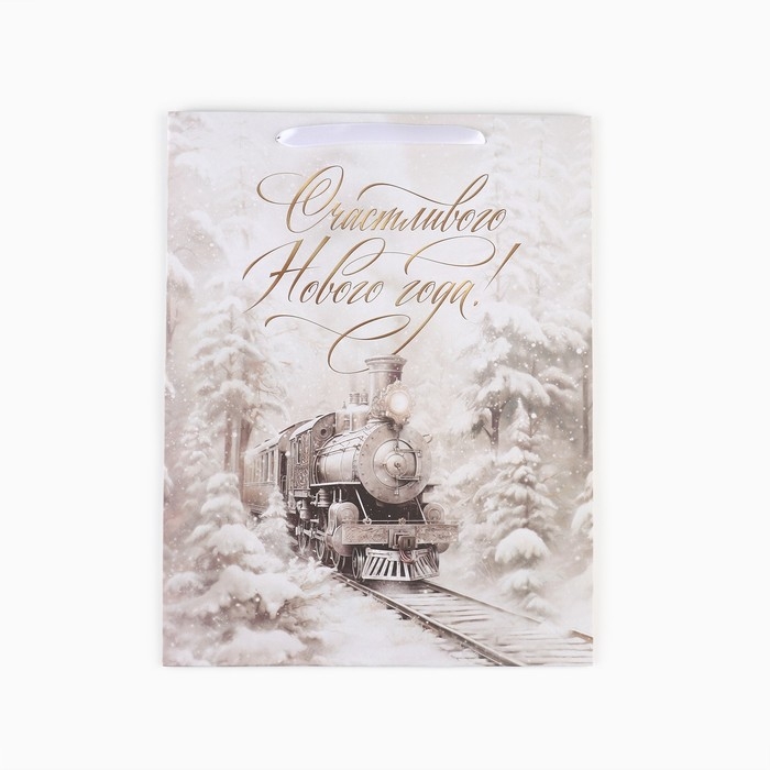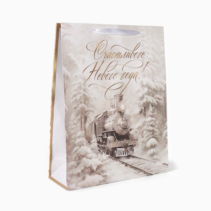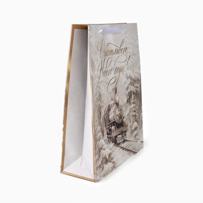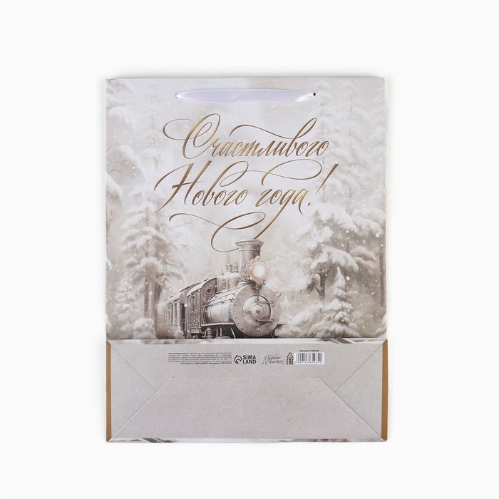 Новый год. Пакет подарочный новогодний крафтовый вертикальный «С Новым годом», поезд, L 31 х 40 х 11.5 см , Новый год