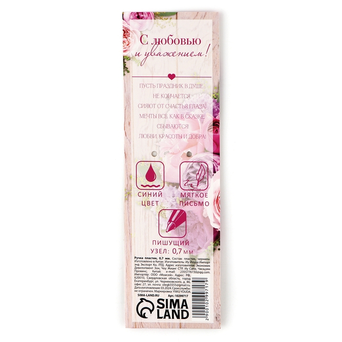 Ручка шариковая синяя паста «Цветок»,пластик, на подложке 8 марта