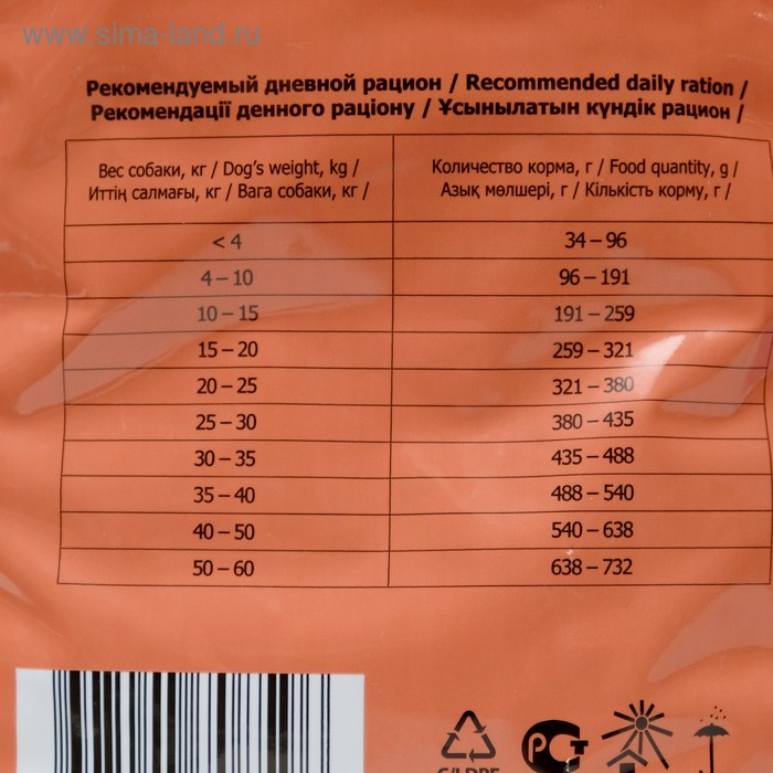 Состав: злаки и продукты растительного происхождения, мясо и продукты животного происхождения (в т. ч. из говядины мин. 4 %), животные жиры и растительные масла, натуральные вкусоароматические добавки, витаминно-минеральная добавка для собак (витамины А, D3, E, B1, B2, B3, B4, B5, B6, B9, B12, H, железо, медь, цинк, марганец, йод, селен), антиоксиданты (Е320, Е321), консервант (мико карб).