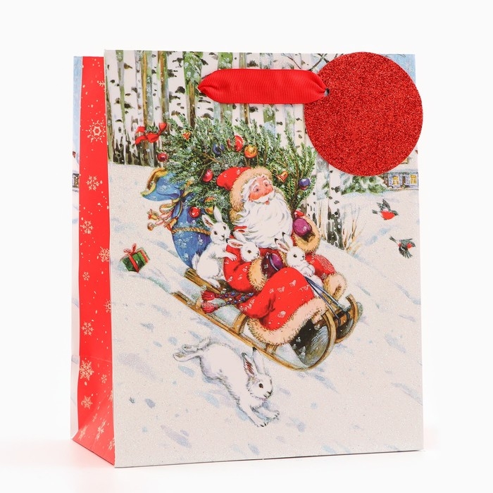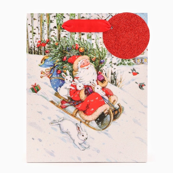 Новый год. Пакет подарочный "На санях", люкс, 18 х 22,3 х 10 см.
