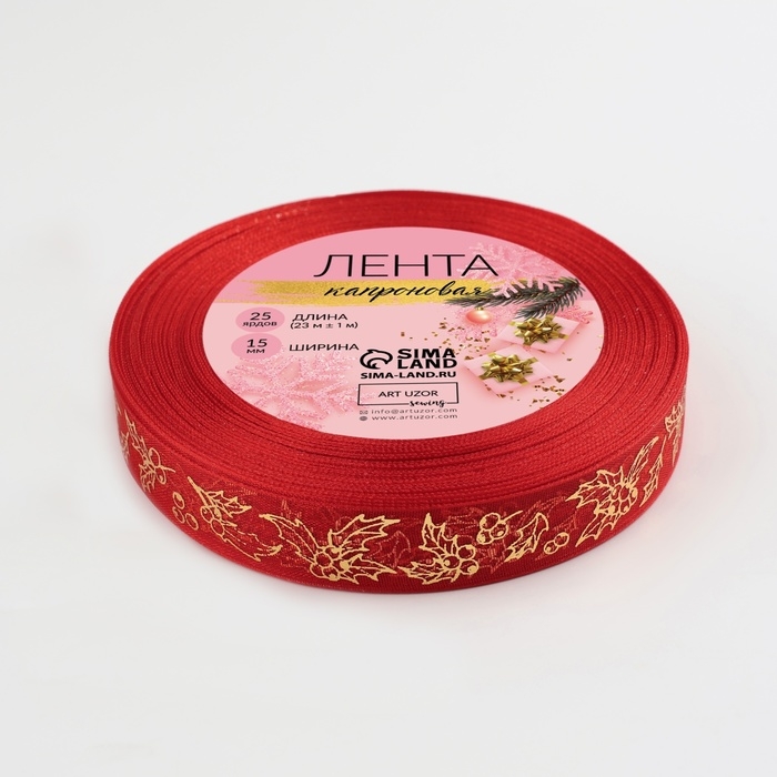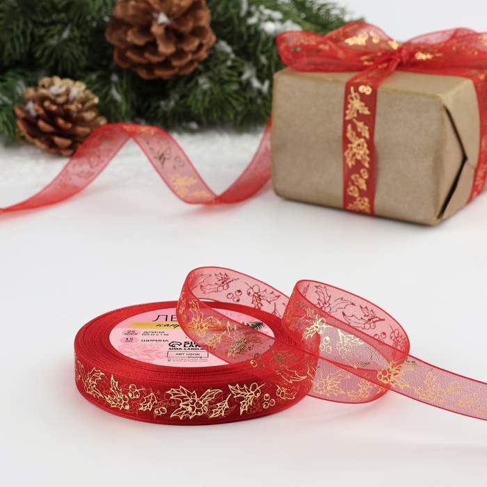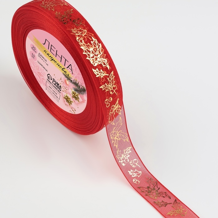 Новый год! Лента капроновая с тиснением «Омела», 15 мм × 23 ± 1 м, цвет красный/золотой