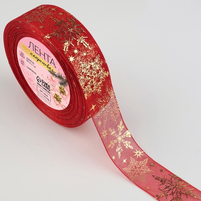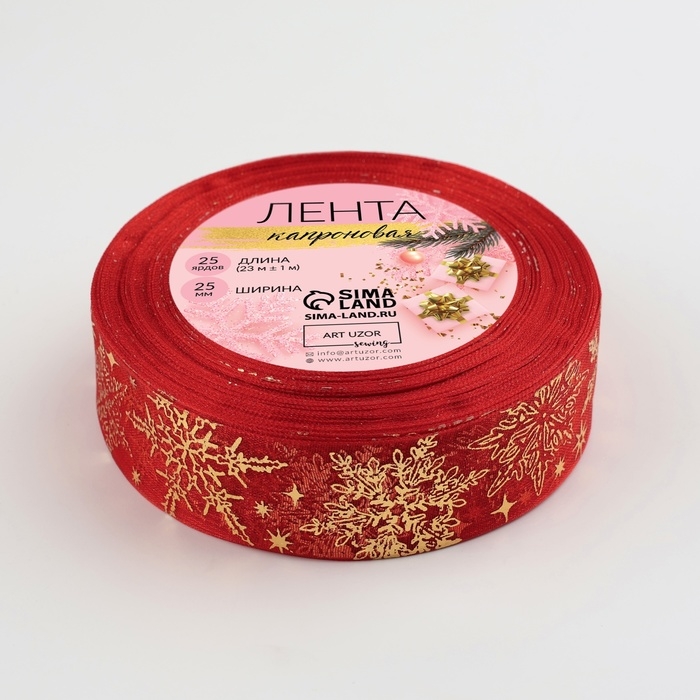 Новый год! Лента капроновая с тиснением «Фигурные снежинки», 25 мм × 23 ± 1 м, цвет красный/золотой