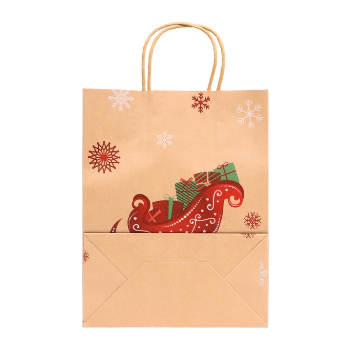 Новый год. Пакет бумажный подарочный новогодний крафт с тиснением "Сани с подарками", 27 х 21 х 11 см.
