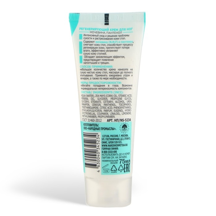 Регенерирующий крем для ног содержит Мочевину (N.M.F натуральный увлажняющий фактор) и Пантенол, смягчает и интенсивно увлажняет кожу, решает проблему сухости и растрескивания кожи стоп. Способствует заживлению микротрещин, предотвращает появление трещин.