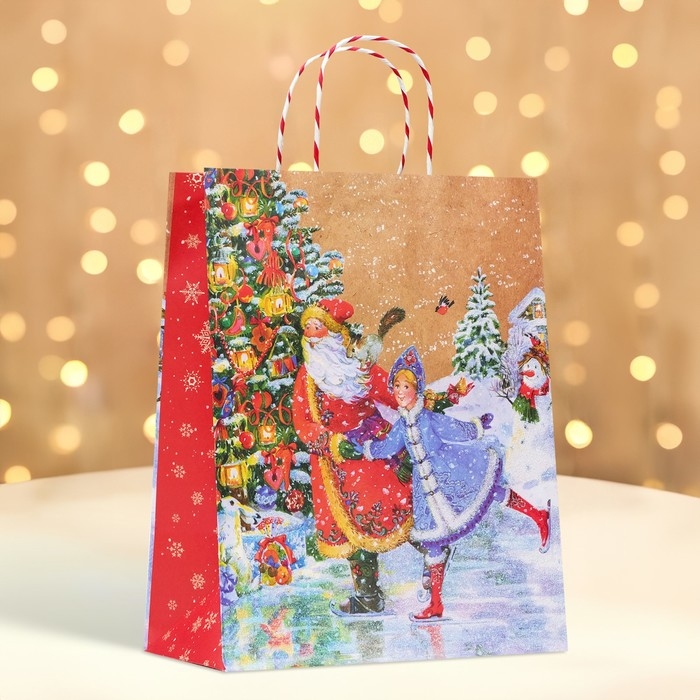 Новый год. Пакет бумажный подарочный новогодний крафт "Дед мороз и снегурочка" 18 х 22,3 х 10 см.