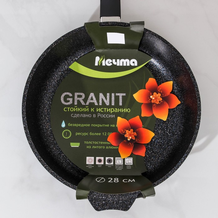 Сковороды серии Granite выполнены из прочного литого алюминия. Посуде не страшна деформация под воздействием высокой температуры, изделие прочное и лёгкое.