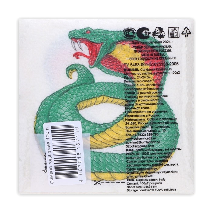 Новогодние салфетки бумажные Гармония цвета «Символ года Змея» 1 слой, 24х24 см, 100 шт