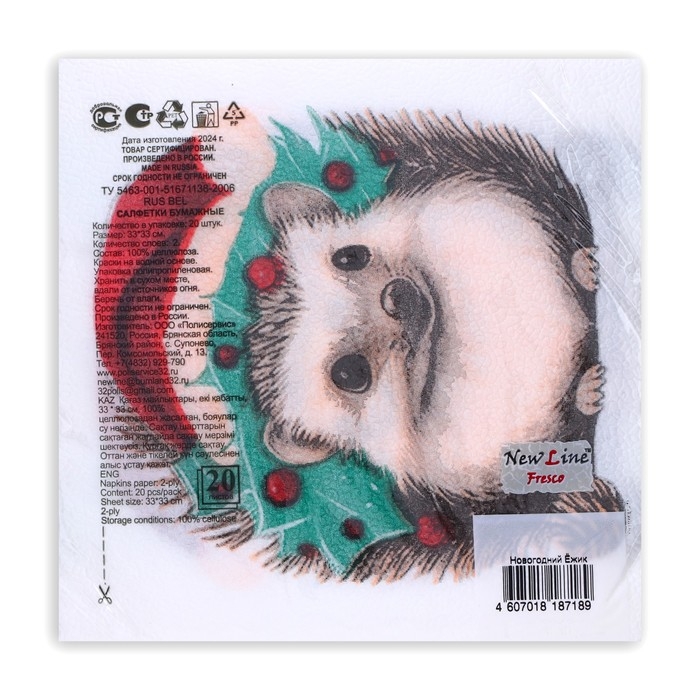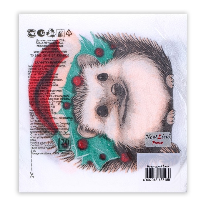 Новогодние салфетки бумажные New Line Fresco «Новогодний ёжик» 2 слоя, 33х33 см, 20 шт