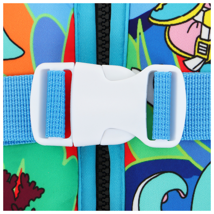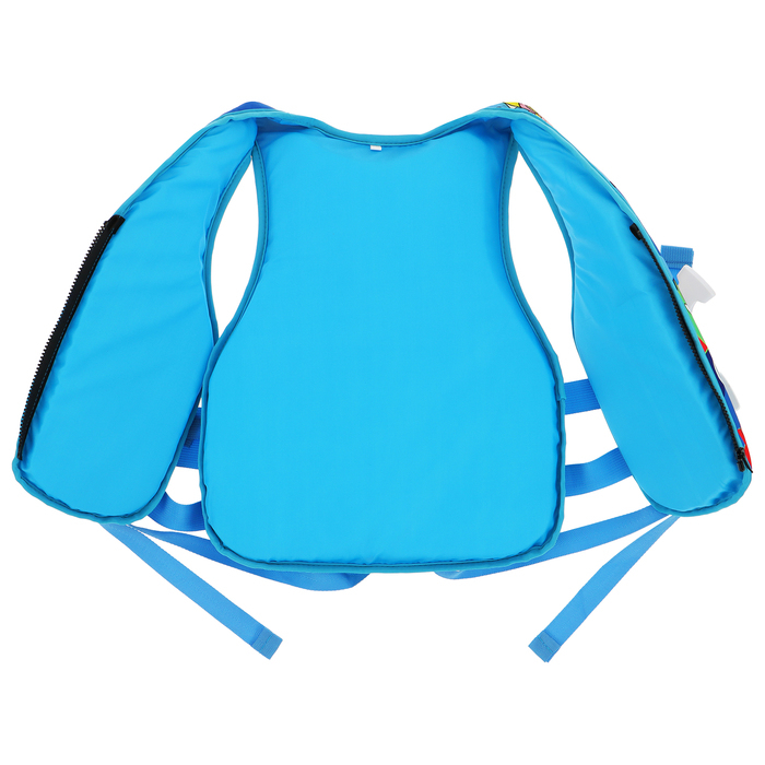 Жилет с поролоновыми вставками предназначен для обучения детей плаванию. Изделие имеет яркую расцветку, которая делает его заметным в воде. Жилет застёгивается на молнию и фиксируется регулируемыми ремешками.
