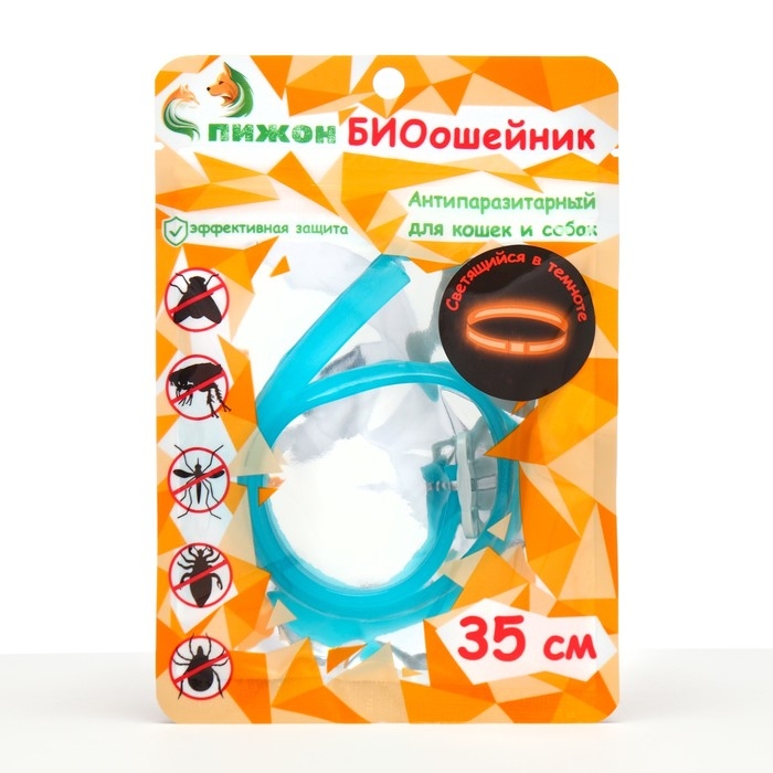 Биоошейник "ПИЖОН" для животных, от блох и клещей, светящийся в темноте, бирюзовый, 35 см