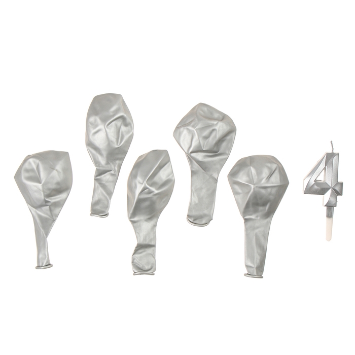 Свечи для торта + 5 шаров, цифра 4, серебро