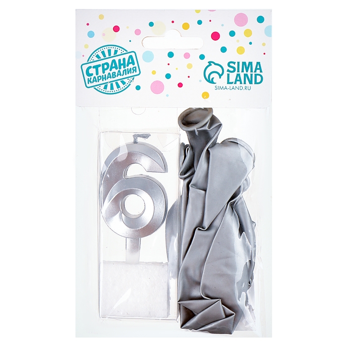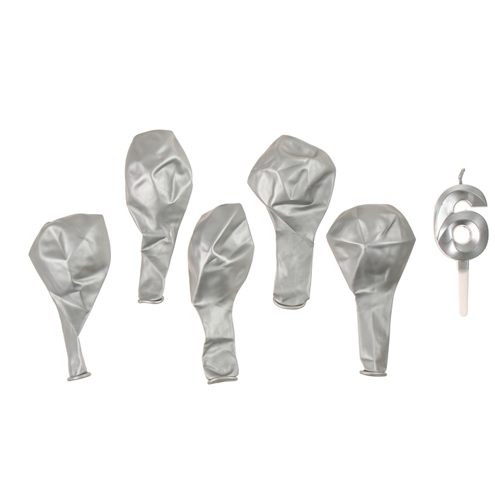 Свечи для торта + 5 шаров, цифра 6, серебро