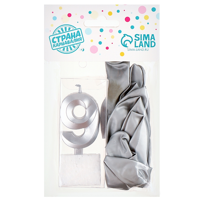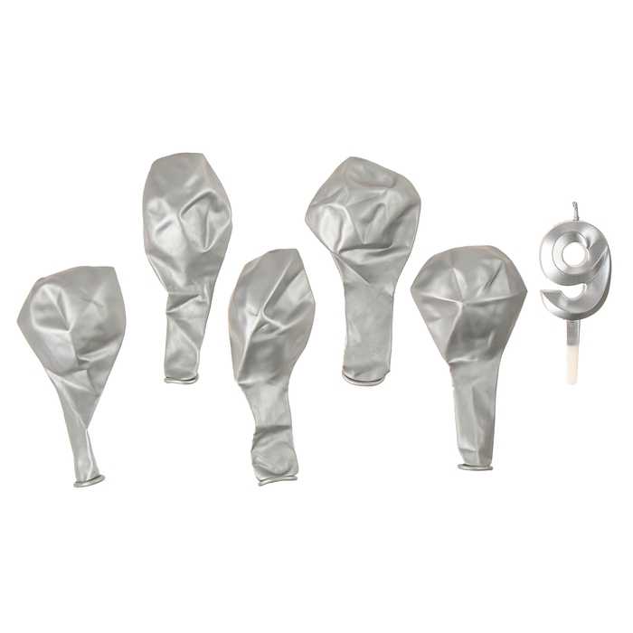 Свечи для торта + 5 шаров, цифра 9, серебро