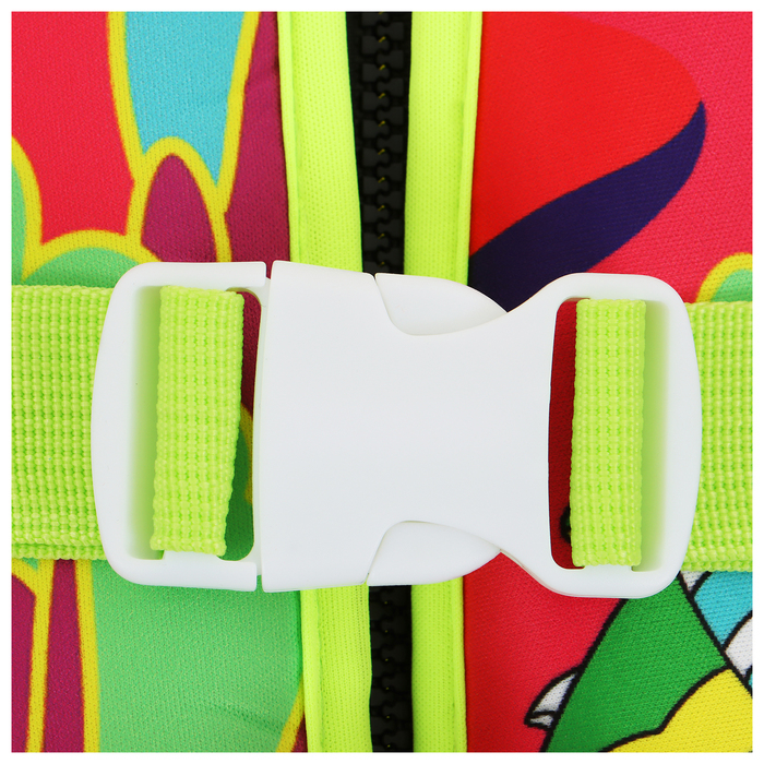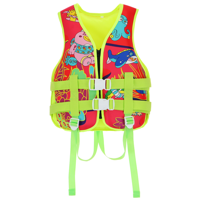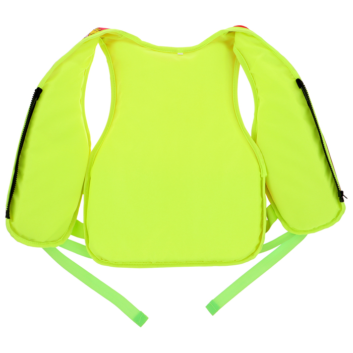Жилет с поролоновыми вставками предназначен для обучения детей плаванию. Изделие имеет яркую расцветку, которая делает его заметным в воде. Жилет застёгивается на молнию и фиксируется регулируемыми ремешками.