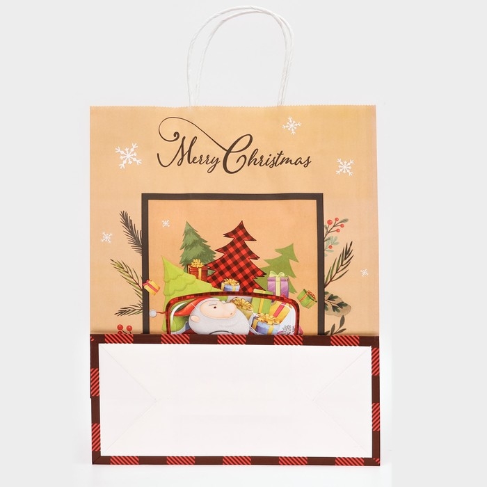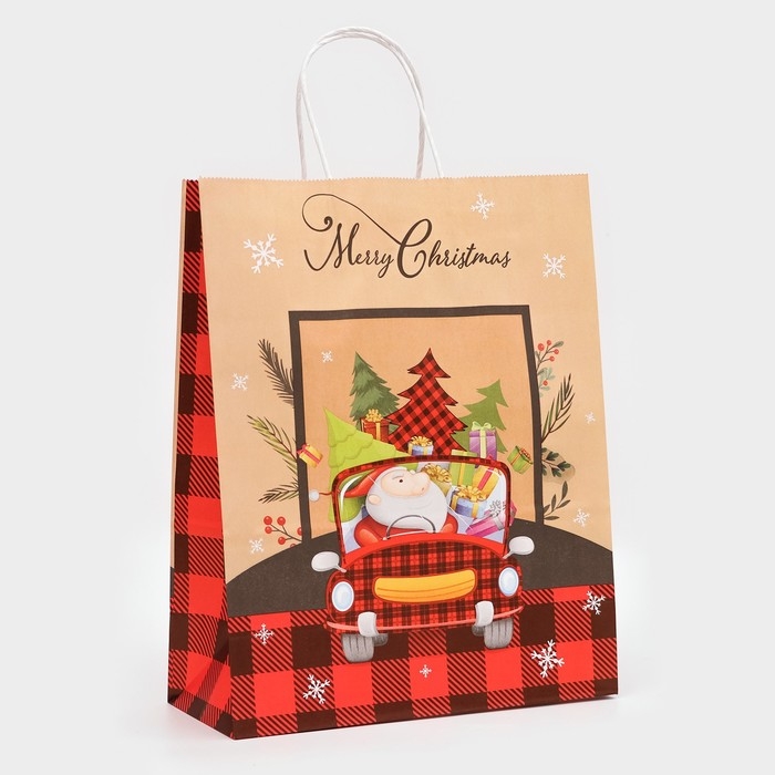Новый год. Пакет бумажный подарочный новогодний крафт "Машина с подарками", 33 × 26 × 12 см.