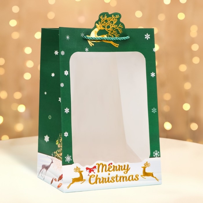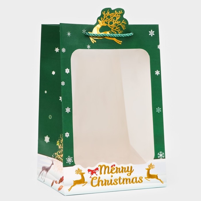 Пакет подарочный с окном новогодний имеет размеры 30 см в длину, 20 см в ширину и 16 см в высоту. Он выполнен из высококачественного материала, который обеспечивает его прочность и долговечность.