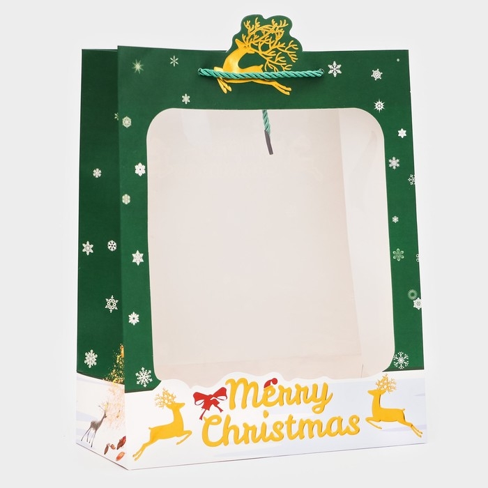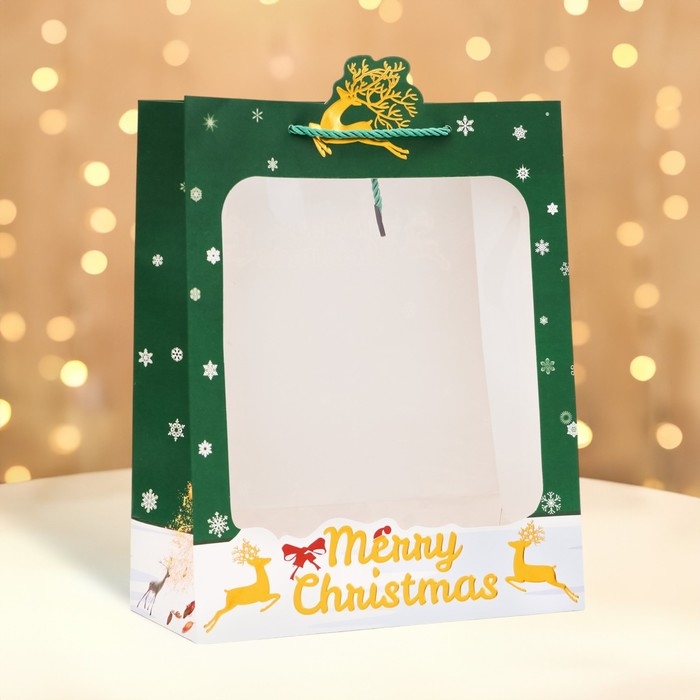 Пакет подарочный с окном новогодний имеет размеры 26 х 32 х 12 см. Он выполнен из высококачественного материала, который обеспечивает его прочность и долговечность.