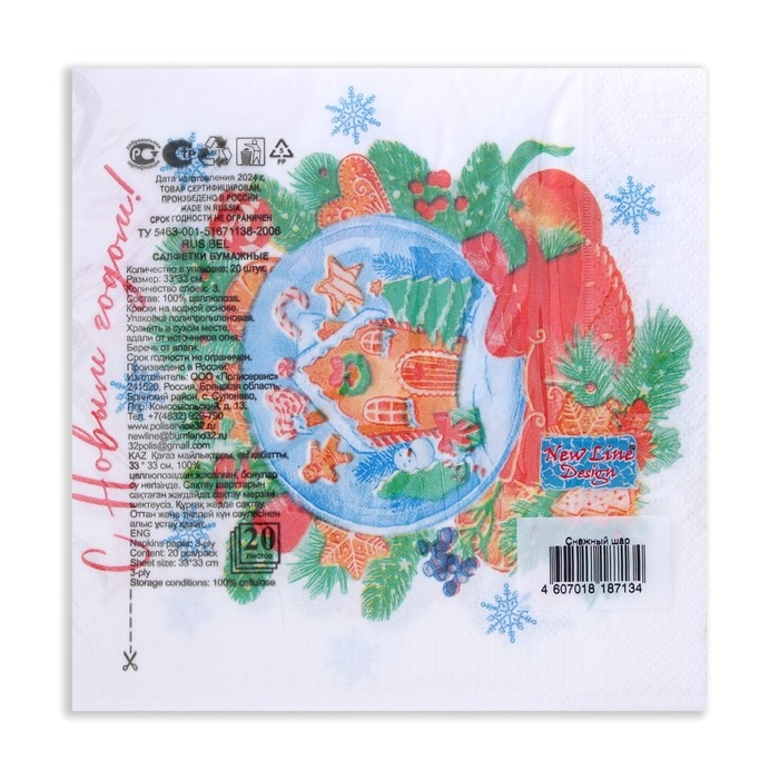Новогодние салфетки бумажные New Line Design «Снежный шар» 3 слоя, 33х33 см, 20 шт