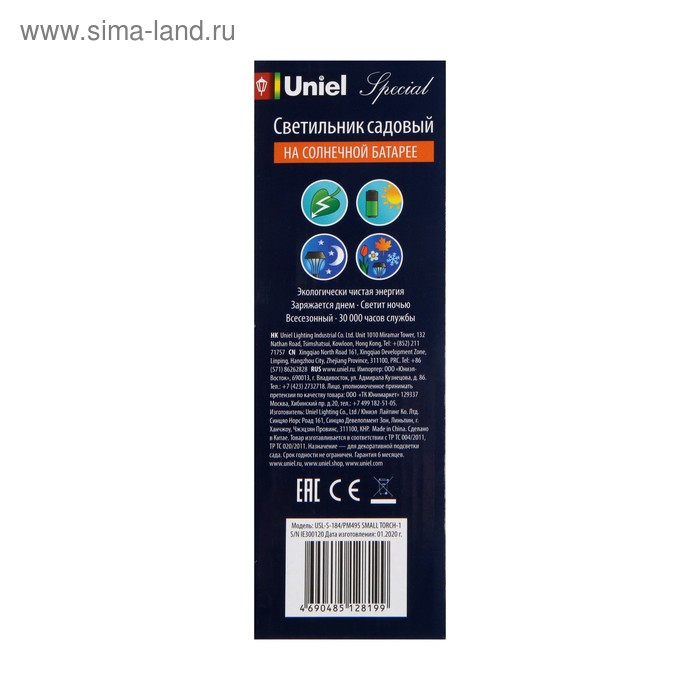 Cадовый светильник на солнечной батарее USL-S-184/PM495 SMALL TORCH-1 предназначен для декоративной подсветки сада — для газонов, клумб, альпийских горок. Прибор устанавливается вертикально в землю с помощью пики. В светильнике используются светодиоды (12 шт), цвет свечения — эффект горящего пламени. Световой поток 1 лм. Срок службы - до 30000 часов. Корпус светильника изготовлен из пластика, цвет — черный, степень пылевлагозащиты IP44. Диапазон рабочих температур светильника от -20 до +35 °С. Подключение к электросети не требуется. Оборудован аморфной солнечной панелью. Заряжается в светлое время суток. Емкость аккумуляторной батареи 150 мАч. Выключатель расположен под крышкой плафона на батарейном блоке. Габариты изделия - ДхШхВ 75х75х500 мм. Размер упаковки - ДхШхВ 78х78х210 мм. Общий вес комплекта 192 г.