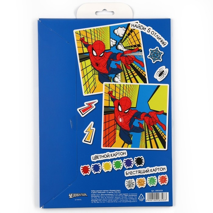 Картон цветной с блёстками, А4, 10 листов, 10 цветов, немелованный, двусторонний, в папке, 250 г/м², Человек-паук