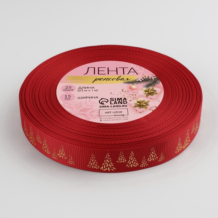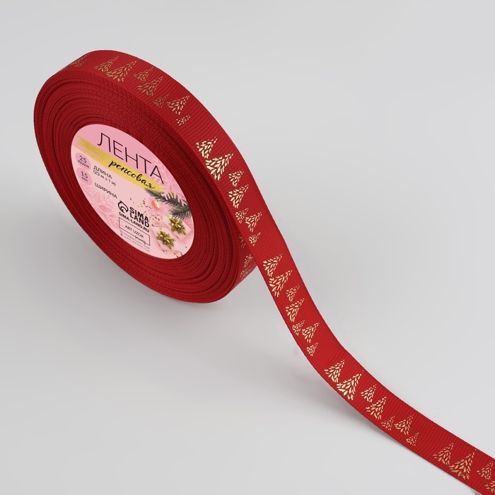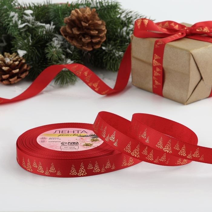 Новый год! Лента репсовая с тиснением «Ёлки», 15 мм, 23 ± 1 м, цвет красный/золото №26