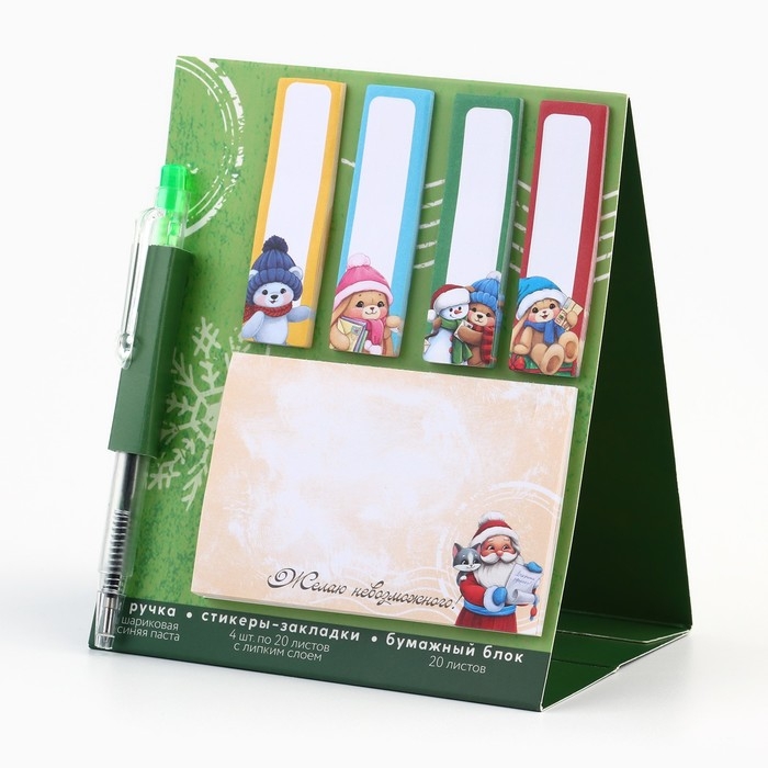Подарочный набор новогодний, стикеры-закладки и ручка «Зима подарит чудеса», 20 л в блоке