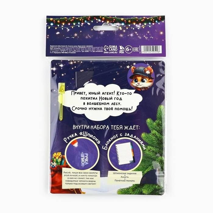В наборе есть блокнот формата А6 на 16 листов для записи секретных дел, а также ручка, которая пишет особыми чернилами, видимыми только под ультрафиолетовым светом. С этим набором вы сможете хранить свои тайны, которые никто не сможет прочитать. В блокноте также есть шпионские задания: анкета и почётная грамота.