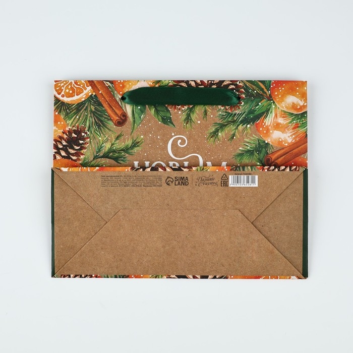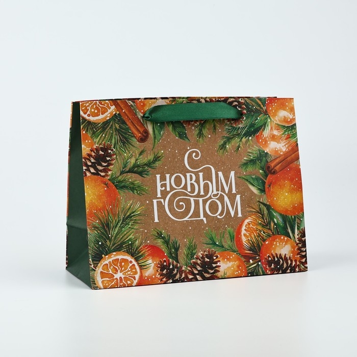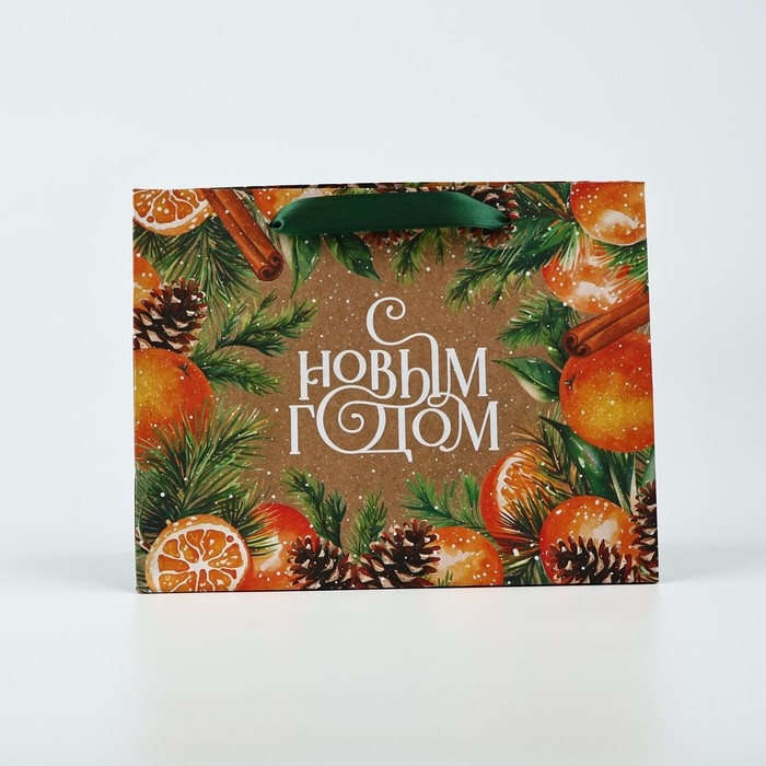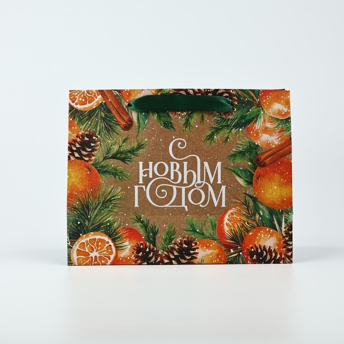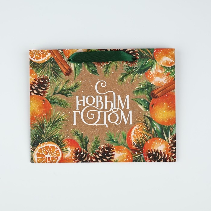 Пакет подарочный новогодний крафтовый вертикальный «С Новым годом», мандарины, MS 18 х 23 х 10 см , Новый год