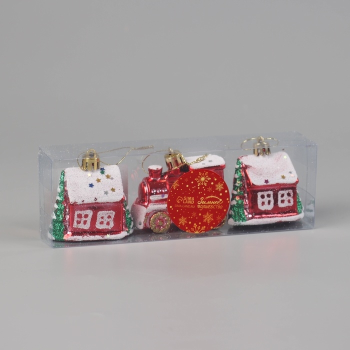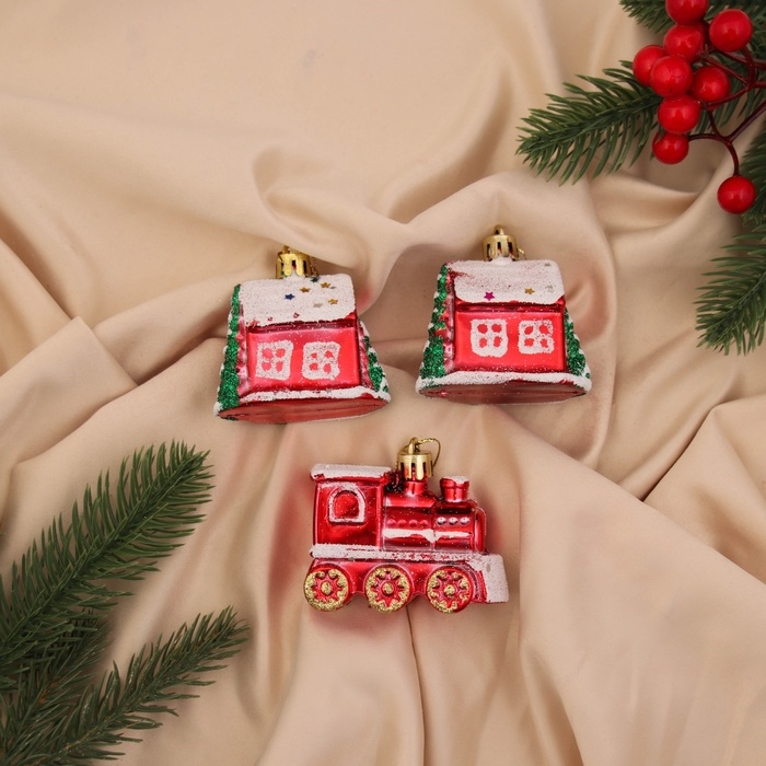 Набор украшений пластик 3 шт "Карнавальный" (2 домика, 1 паровозик) 6х6 см, красный