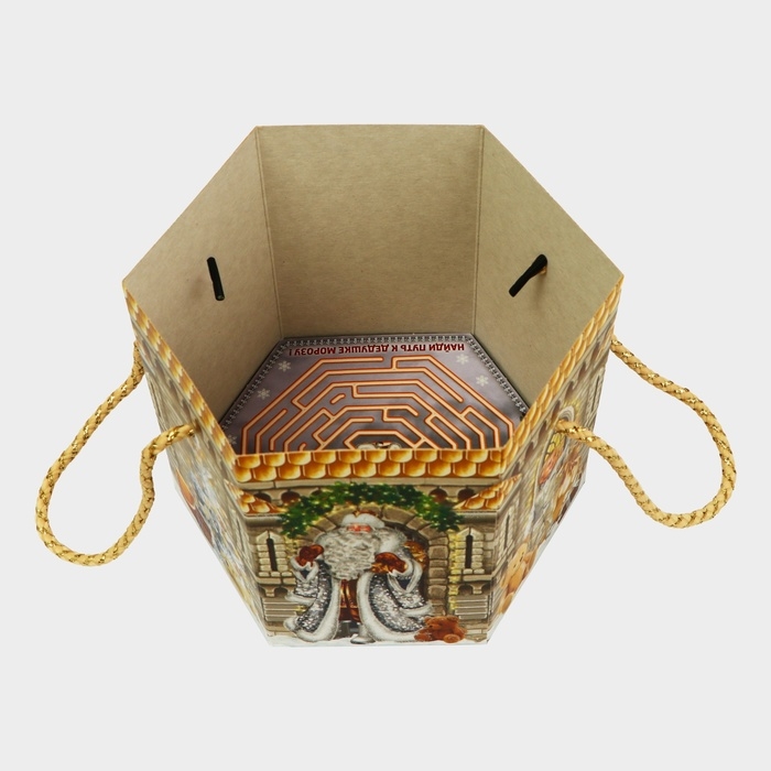Новый год. Подарочная коробка новогодняя Шестигранник малый "Новогодний шарм" с веревочными ручками, 210x210x185 мм.
