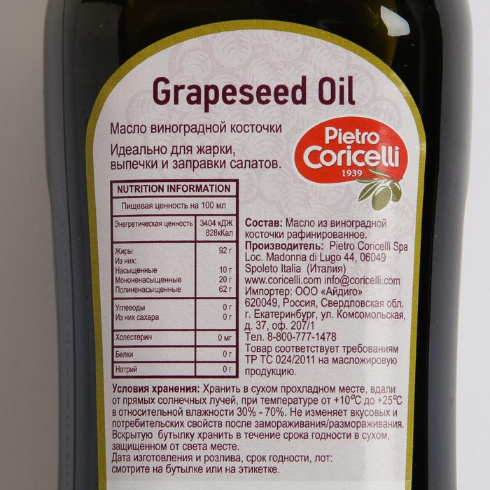 Масло виноградное Pietro Coricelli, полученное из виноградных косточек, обладает мягким, чуть сладковатым вкусом, и прекрасно подходит для маринования рыбы и мяса, заправки салатов и сыров. Благодаря высокой температуре дымления идеально и для жарки. Масло виноградной косточки богато ненасыщенными жирными кислотами, полезно для здоровья, а также красоты - его применяют для приготовления масок и скрабов для кожи.