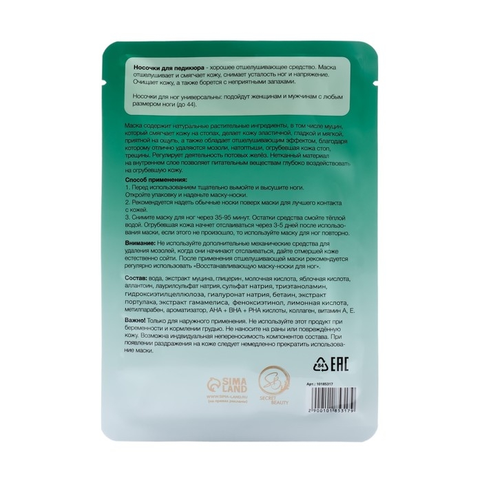 Отшелушивающая маска-носки для ног на основе экстракта улитки – это универсальное средство для ухода за кожей стоп, которое обеспечивает глубокое очищение и интенсивное питание. Эта маска-носки помогут избавиться от огрубевшей и сухой кожи, возвращая ногам мягкость и гладкость.