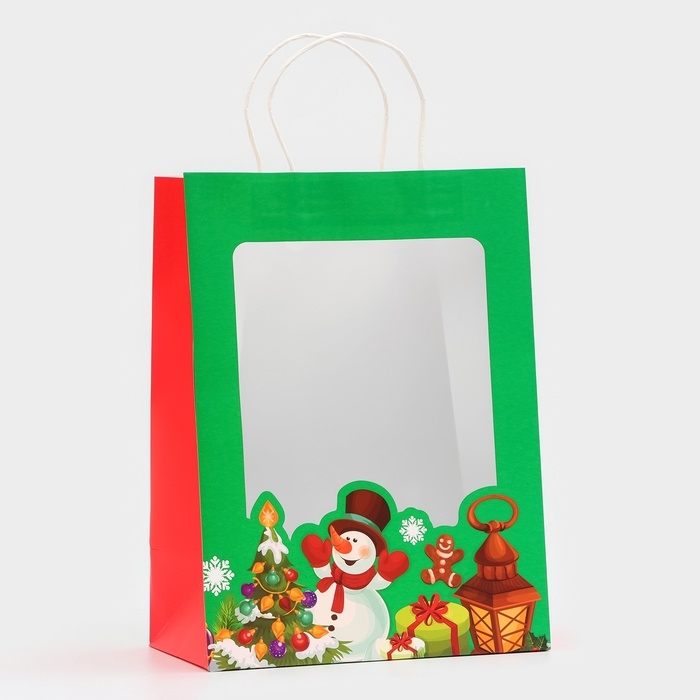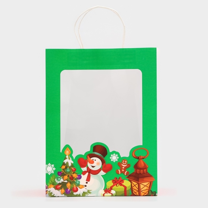 Пакет подарочный новогодний с окном "Снеговик" 26 х 35 х 16 см.