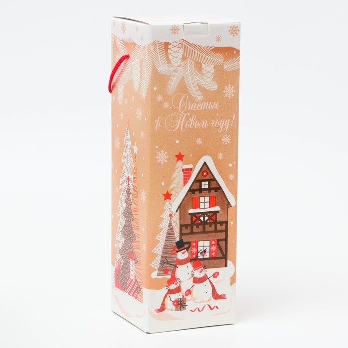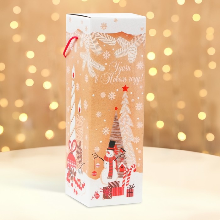 Новый год. Подарочная коробка, Новогодняя под шампанское "Елочки" с веревочной ручкой 11 х 11 х 35 см.
