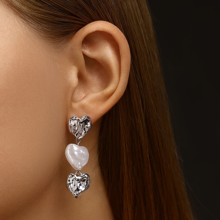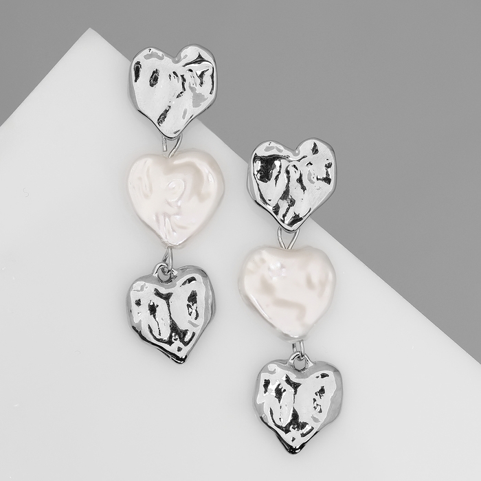 Серьги с жемчугом «Сердца» трио, цвет серебро