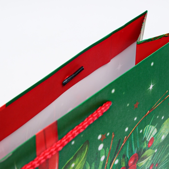 Подарочный новогодний пакет имеет оптимальные размеры, позволяющие упаковать различные предметы, от небольших сувениров до крупных подарков. Он также может быть использован для хранения и транспортировки продуктов питания, например сладких подарков под ёлку, так как материал, из которого он изготовлен, является безопасным для контакта с пищевыми продуктами.