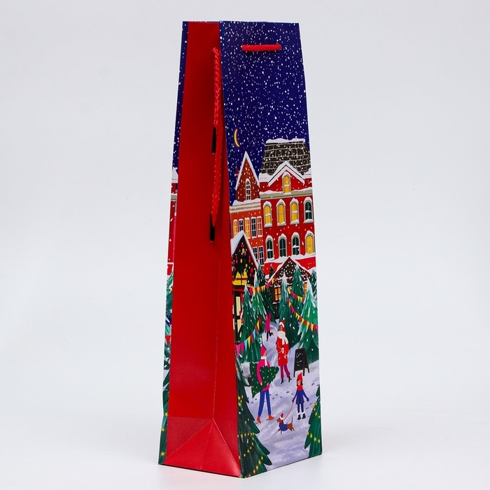 Новый год. Пакет подарочный новогодний под бутылку, упаковка "Праздник в городе", 12 х 36 х 8,5 см.