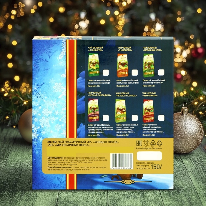 Каждый вид чая надёжно упакован, что обеспечивает сохранение свежести и аромата чая, а новогодний дизайн коробки делает его еще более привлекательным. Такой подарок создаст праздничное настроение и подарит много положительных эмоций.