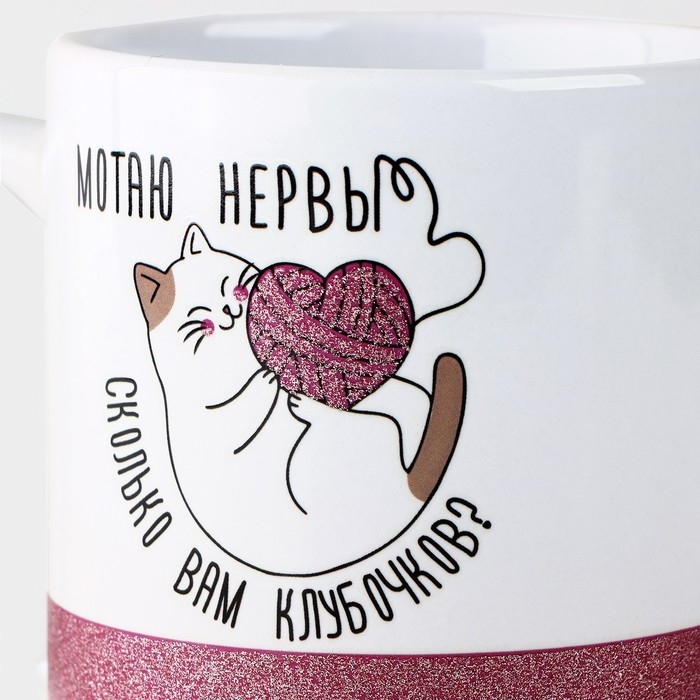 - Дизайн кружки выполнен в белом цвете с блестящей вставкой внизу и рисунком с надписью "Мотаю нервы".