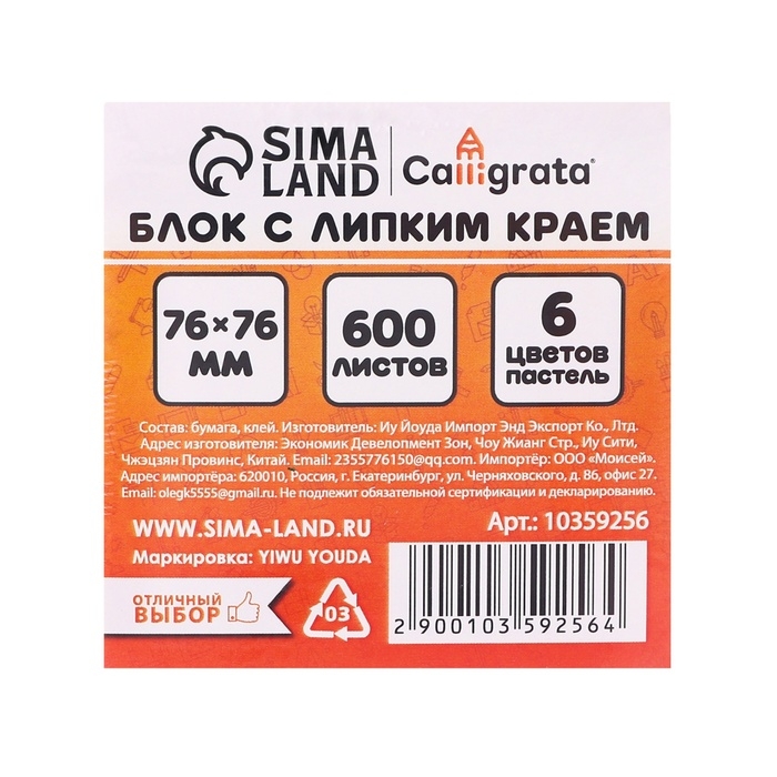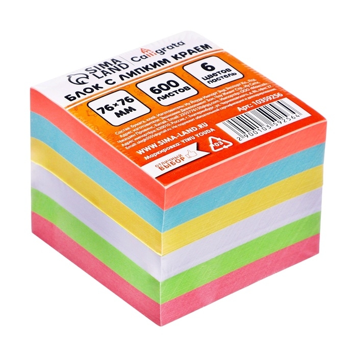 Блок с липким краем 76мм*76мм 600л, 6 цветов