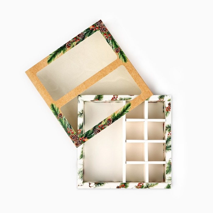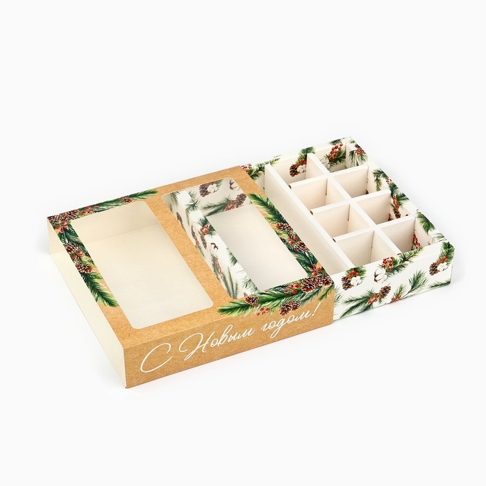 Коробка под 8 конфет и шоколад с ячейками «С Новым годом!», еловые веточки, 18 х 18 х 4 см, Новый год