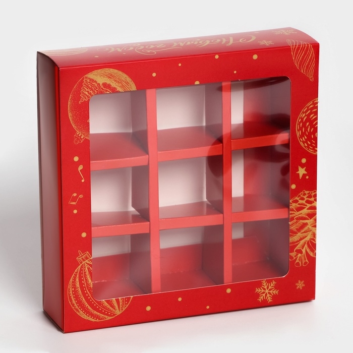 Эта новогодняя подарочная коробка для конфет – идеальный вариант для создания праздничного настроения и приятных сладких сюрпризов. С размерами 13,8 х 13,8 х 3,8 см, она вмещает ровно 9 конфет, что делает её компактной и аккуратной, но в то же время способной подарить массу удовольствия.